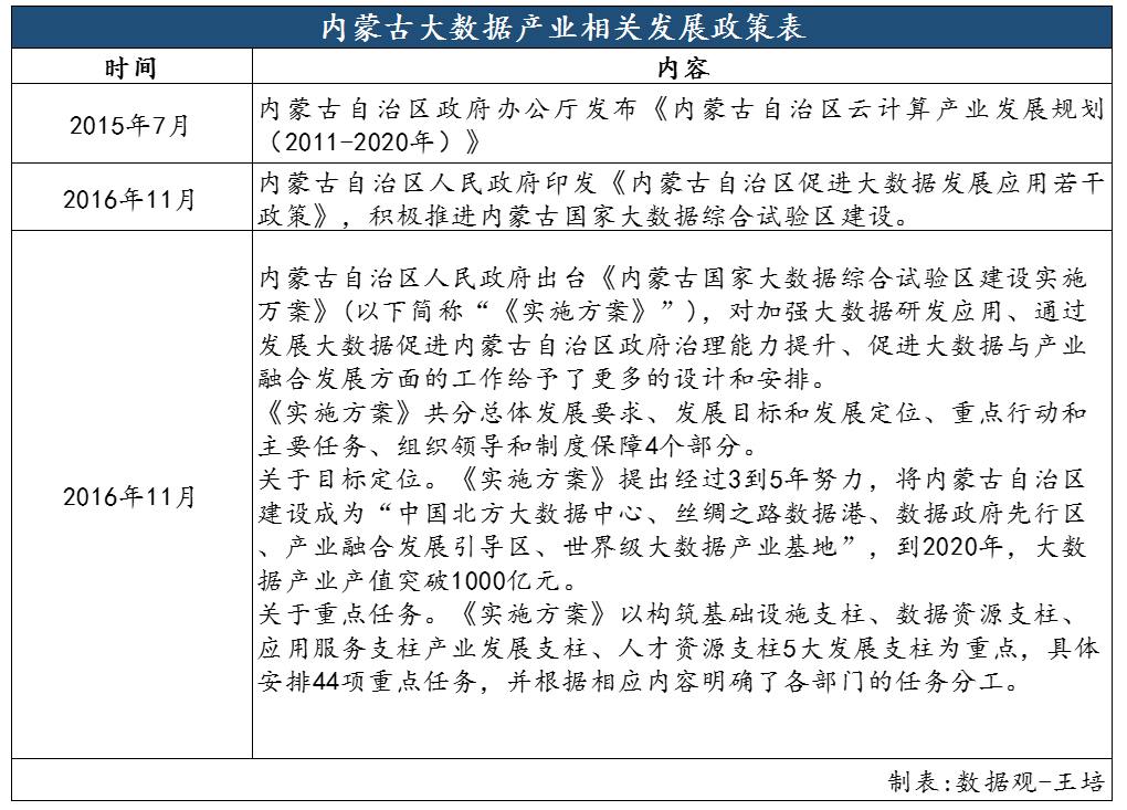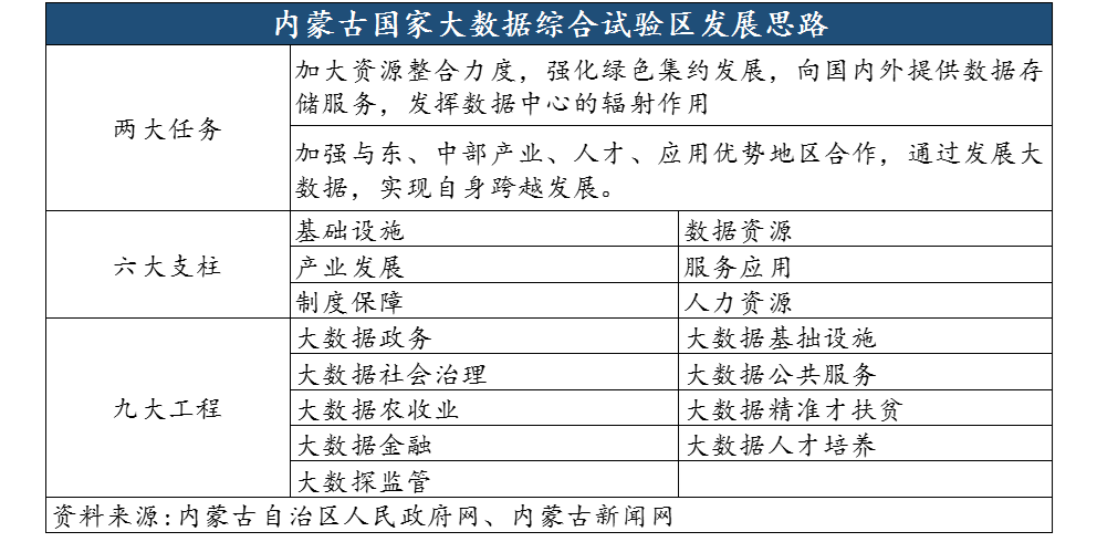 2016年10月8日,国家发展改革委、工业和信息化部、中央网信办发函批复,正式将内蒙古列为国家大数据综合试验区,是目前唯一的大数据基础设施统筹发展类综合试验区。