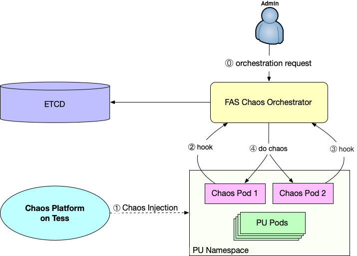 3)执行故障注入任务的Pod先后向FAS Chaos Orchestrator发送注入通知;