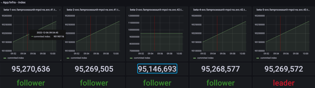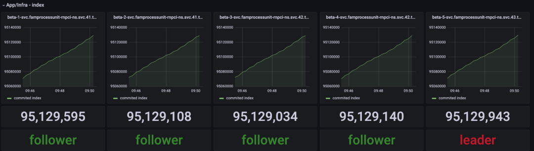 此时,整个集群处于健康状态,各个跟随者节点从领导者节点同步日志(raft log),各个节点日志的提交索引(commit index)相差在合理范围内。网络延迟故障注入后,集群监控如图7所示。