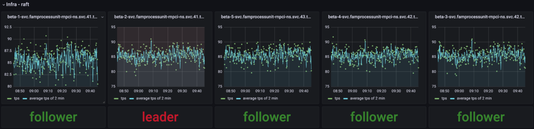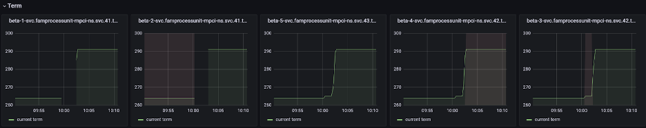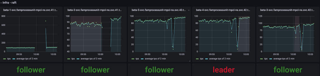 在可用性实验中,PU集群在少数派节点出现故障期间依然能正常接收线上流量。但FAS团队发现,故障节点恢复后,PU集群TPS短暂下降(如图4所示)。同时,故障节点恢复期间,集群发生多次选主(领导者选举)(如图5所示),造成FAS集群处理性能的下降。