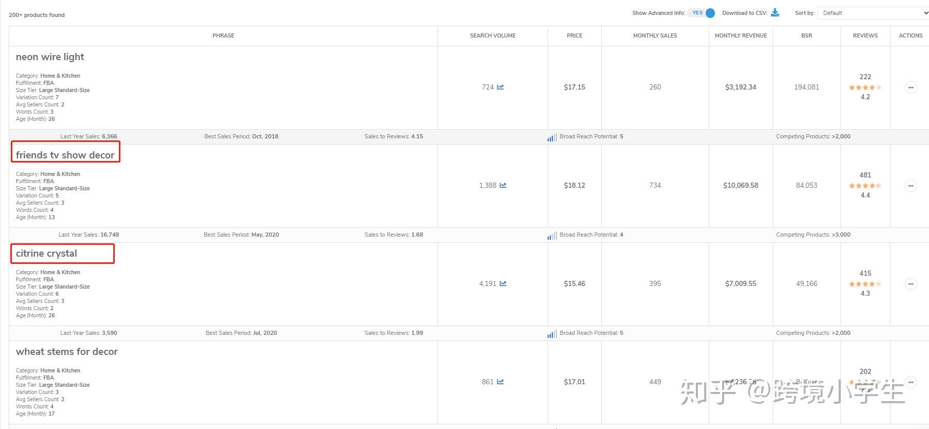 在筛选出来的关键词中,新手可以将有以下特征的产品关键词直接pass:容易侵权(如下图第一个红框中影视作品周边)、体积过大过重的(下图第二个红框中石头摆件)、季节性比较明显的(如第三个红框中万圣节产品)