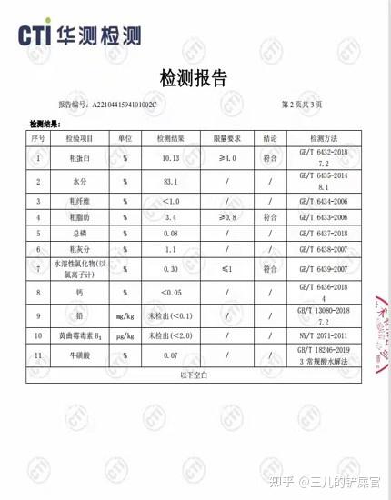 营养成分:粗纤维≤1.00%、粗蛋白≥10.8%、粗脂肪≥1.50%、水分≤83.0%、粗灰分≤2.50%