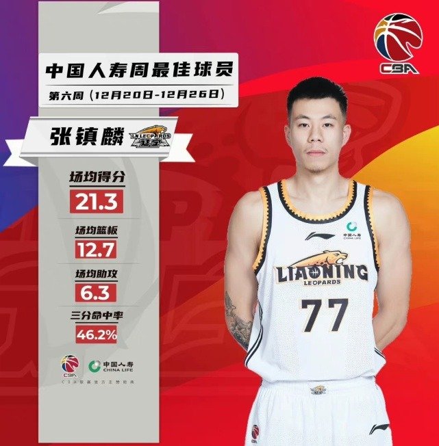 北京时间12月27日,CBA官方公布了周最佳球员的名单,辽宁男篮锋线张镇麟成功当选,外援则是深圳男篮的萨林杰。上周出战三场比赛,场均出战21.3分12.7篮板6.3助攻2抢断,尤其是三分球命中率高达46.2%。