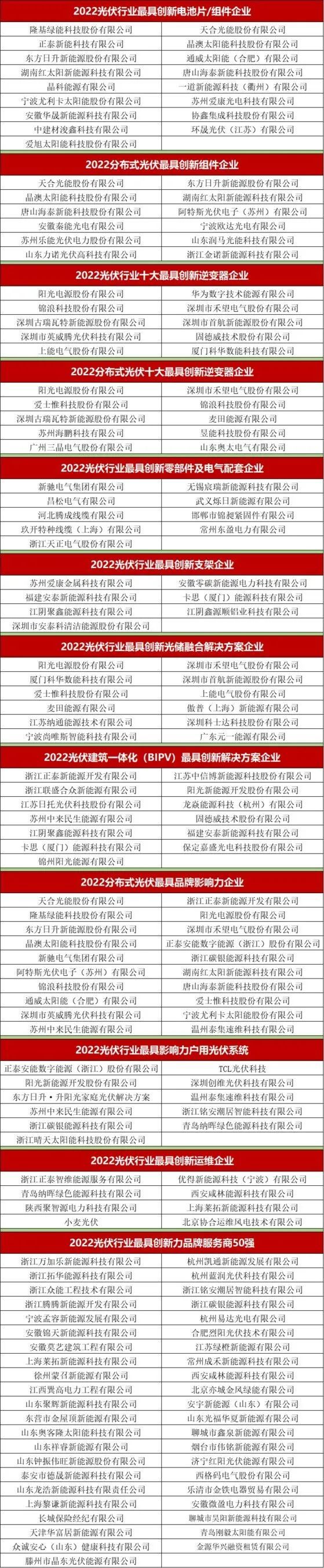 “PV TOP 50”2022光伏创新榜除了发布“2022光伏行业最具创新力品牌服务商50强”榜单,同时也评选出了“2022光伏行业最具创新电池片/组件企业”、“2022分布式光伏最具创新组件企业”、“2022光伏行业十大最具创新逆变器企业”、“2022分布式光伏十大最具创新逆变器企业”、“2022光伏行业最具创新零部件及电气配套企业”、“2022光伏行业最具创新支架企业”、“2022光伏行业最具创新光储融合解决方案企业”、“2022光伏建筑一体化(BIPV)最具创新解决方案企业”、“2022分布式光伏最具品牌影响力企业”、“2022光伏行业最具影响力户用光伏系统”、“2022光伏行业最具创新运维企业”等十一大创新奖项。